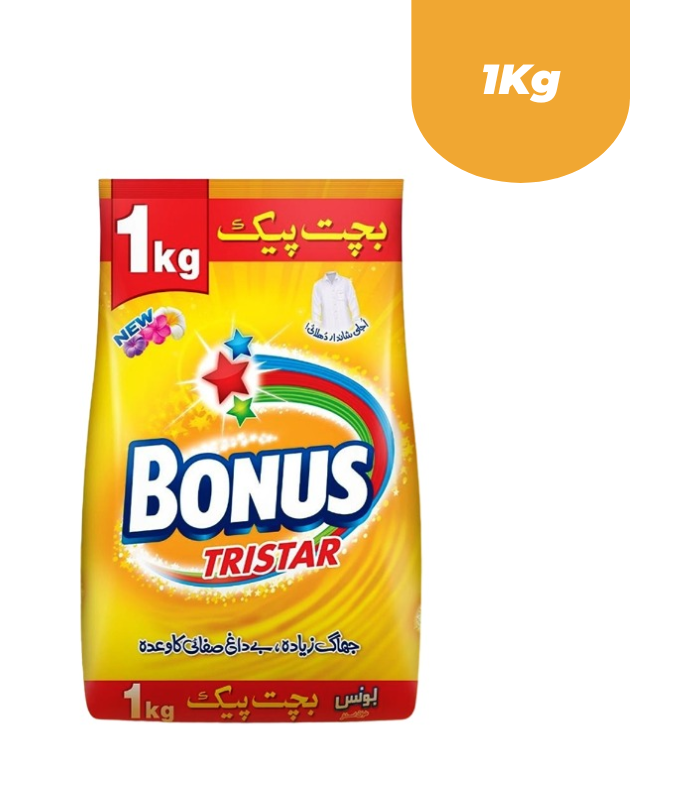 Bonus Tristar is a leading, popular detergent powder in Pakistan, designed to offer superior cleaning over traditional laundry methods. It provides powerful stain removal, high foaming for deep cleaning, and a pleasant fragrance, suitable for both hand washing and machines.