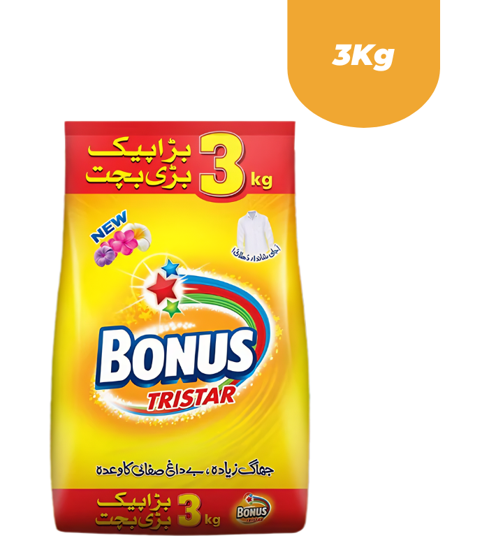 Bonus Tristar is a leading, popular detergent powder in Pakistan, designed to offer superior cleaning over traditional laundry methods. It provides powerful stain removal, high foaming for deep cleaning, and a pleasant fragrance, suitable for both hand washing and machines.
