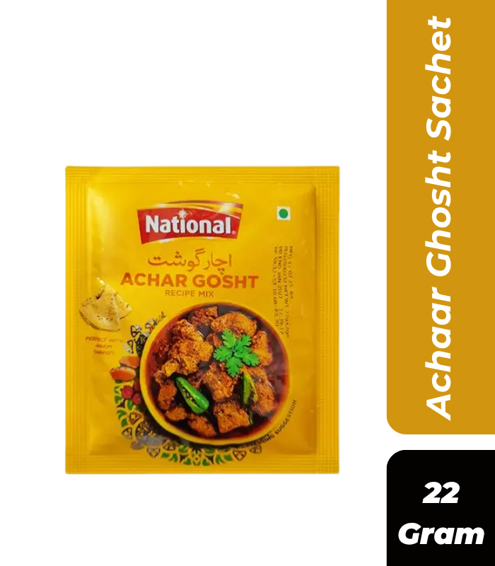 National Foods Achar Gosht Masala is a pre-mixed, aromatic spice blend designed to create traditional Pakistani pickling-flavored meat curry (mutton, beef, or chicken). It combines tangy and spicy notes—featuring mango powder, fenugreek, and cumin—to create a restaurant-quality dish characterized by tender meat in a thick, flavorful gravy.