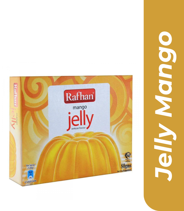 Rafhan Mango Jelly  is a popular, easy-to-prepare, bright yellow, fruit-flavored gelatin dessert with a sweet, tangy taste. It creates a smooth, bouncy, and refreshing treat that is ideal for summers, setting in minutes in the refrigerator, and can be used in puddings, cakes, or paired with custard.